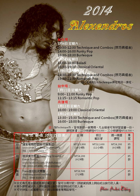1月5日 星期日13:00~16:00 Baladi16:30~19:30 Classical Oriental1月6日 星期一14:30~16:30 Technique and Combos19:30~21:30 Romantic Pop註: